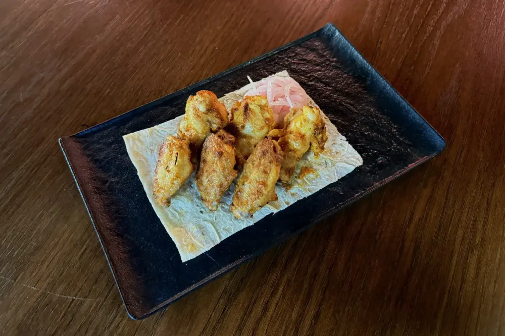 Куриные крылья в фирменном маринаде с грузинскими специями, подаются на лаваше с маринованным луком.